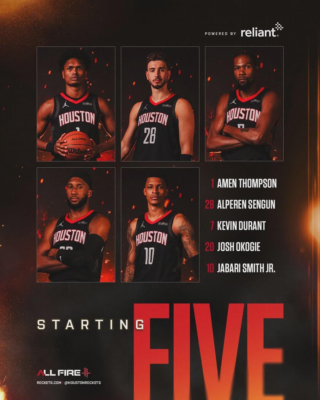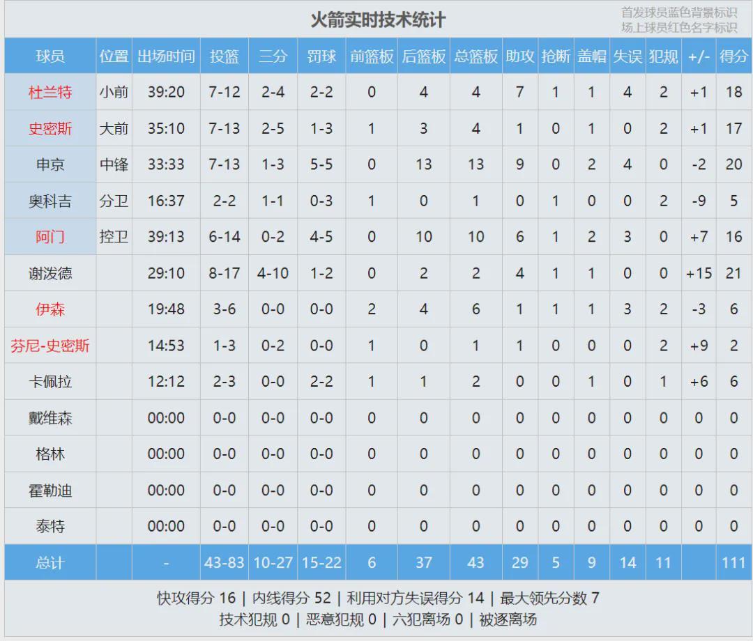 火箭本场首发:阿门-汤普森,奥科吉、杜兰特、小贾巴里-史密斯、申京。马刺首发:卡斯尔、福克斯、尚帕尼、巴恩斯、文班亚马。马刺第一节投疯了,全队三分球13中8,其中尚帕尼三分5中4。文班有点扎心,首节投篮3中0。