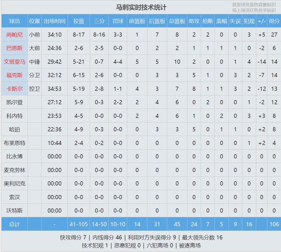 自文班剃头之后,此前3胜0负,今天第一次输球。最后看看数据,说说感受: