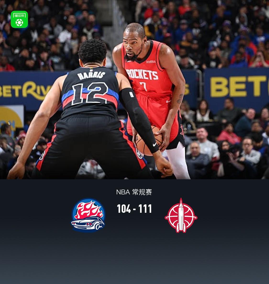第四节活塞斯图尔特拿下7分,火箭杜兰特拿下6分,最终活塞104-111不敌火箭